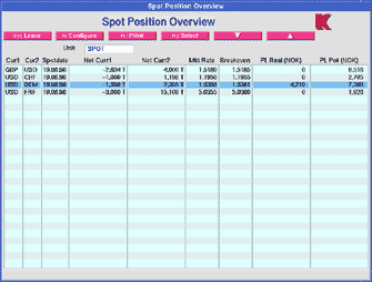 Profits are losses are calculated using current using market rates, parameter rates and optionally a simulation rate. Scrolling keys allow a rapid navigation through the different currency pairs having spot positions. |